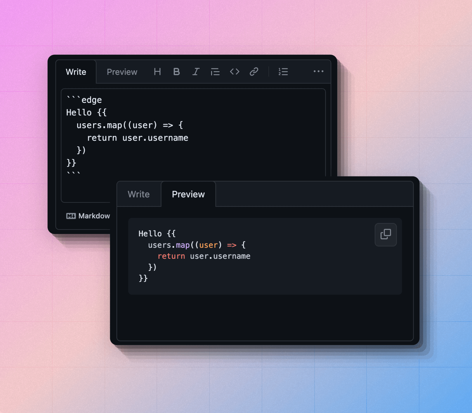 To enable syntax highlighting, you must set the code block language to edge, as shown in the following example.